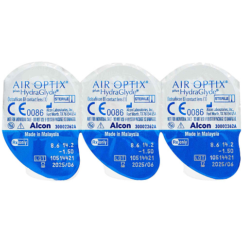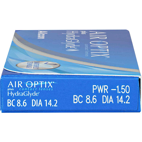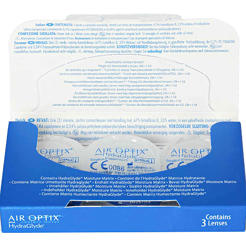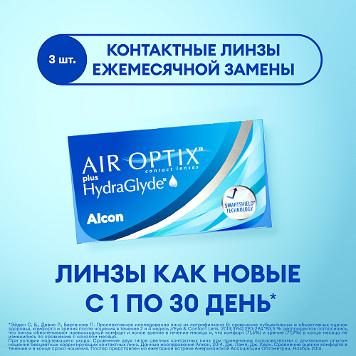 Alcon Air Optix plus HydraGlyde — мягкие контактные линзы. Они комфортно корректируют зрение, обеспечивая увлажненность роговицы глаза в течение всего дня. Материал изготовления – силикон-гидрогель. В упаковке три контактные линзы с ежемесячной плановой заменой. Каждая из них герметично упакована в пластиковый блистер с буферным солевым раствором и стерилизована паром.