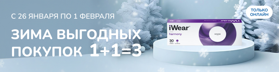 Скидка действует при единовременной покупке комплекта из 3 упаковок контактных линз "iWear Harmony 30" одинаковых диоптрий.